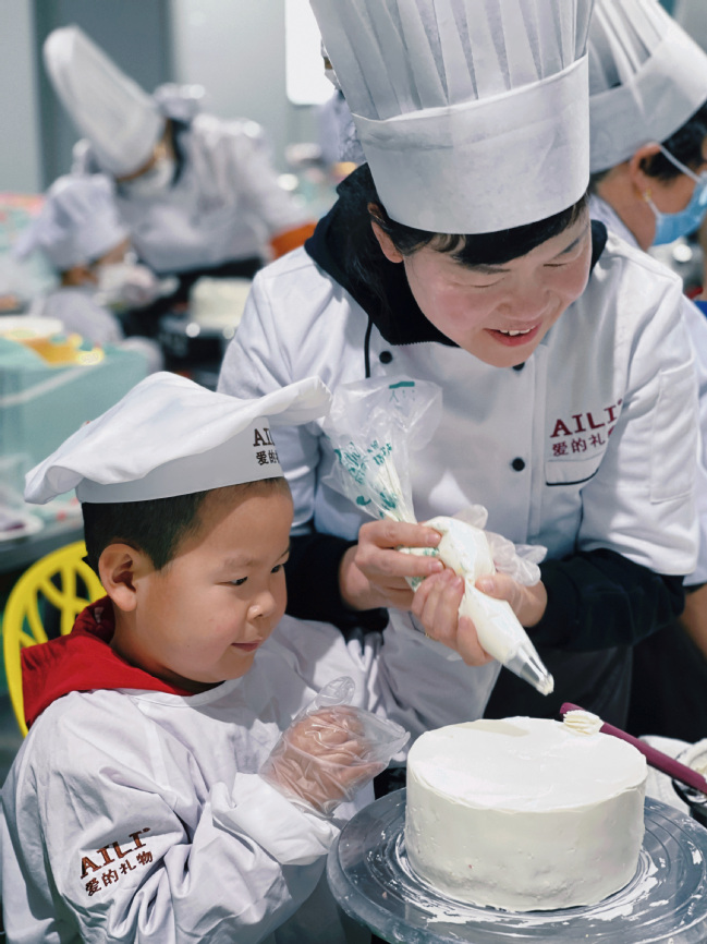 随后进入烘培环节。在工作人员引导下,大家穿上专用工作服,进行规范的净化、消毒后,有序进入蛋糕制作间。孩子们一人一个制作台,随着专业蛋糕师的讲解,专注地和妈妈一起探索、创作:抹面、裱花、巧克力插片、水果造型、题字……有的家庭手忙脚乱,有的家庭有条不紊,现场洋溢着暖暖的爱意和欢乐,每一帧画面都饱含温馨与幸福。完成蛋糕制作后,女教职工和孩子们还参观了工厂流水线,最后领取了自己制作的创意蛋糕。
